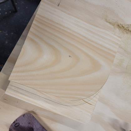 After sketching up some ideas and looking at the lumber that I wanted to use for this project, I cut the pieces to size. The top and back piece are the same length and width and the side pieces will need to be cut down and into the desired shape. Since I wanted to make a paper towel holder, I kept the side pieces fairly big but gave them a curve. I traced a round piece of sandpaper for the curve.