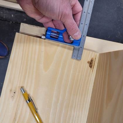 I mark the layout on the top piece where the nails need to go. I’m aiming for the center of the back piece. The back piece is ¾” thick, so I inset the marks ⅜”.