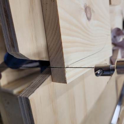 Cutting the supports out with the coping saw. Note, I’m keeping the coping saw plumb (vertically straight) and within the V notch of the jig.